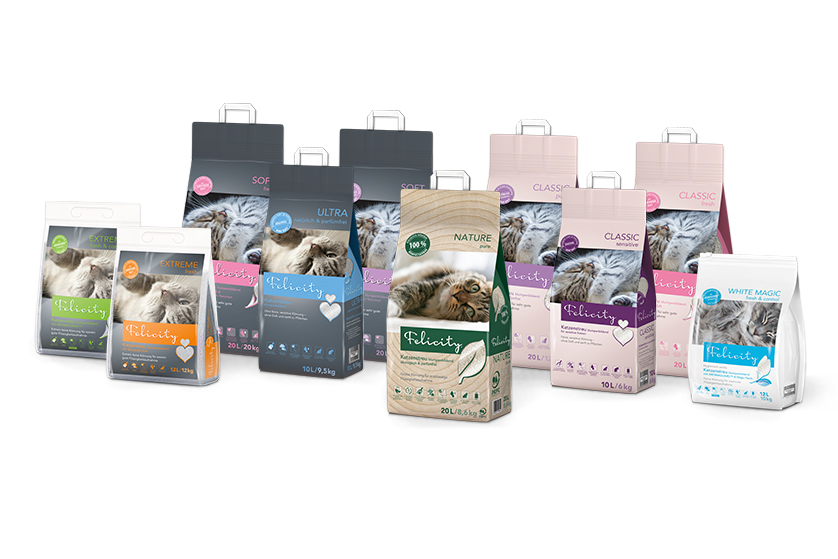 Felicity Katzenstreu ist in verschiedenen Stärkegraden erhältlich, zur optimalen Abstimmung auf die Bedürfnisse Ihres Stubentigers und die häusliche Umgebung. Auch für sensible Katzen und Kitten gibt es hochqualitative Felicity-Produkte.